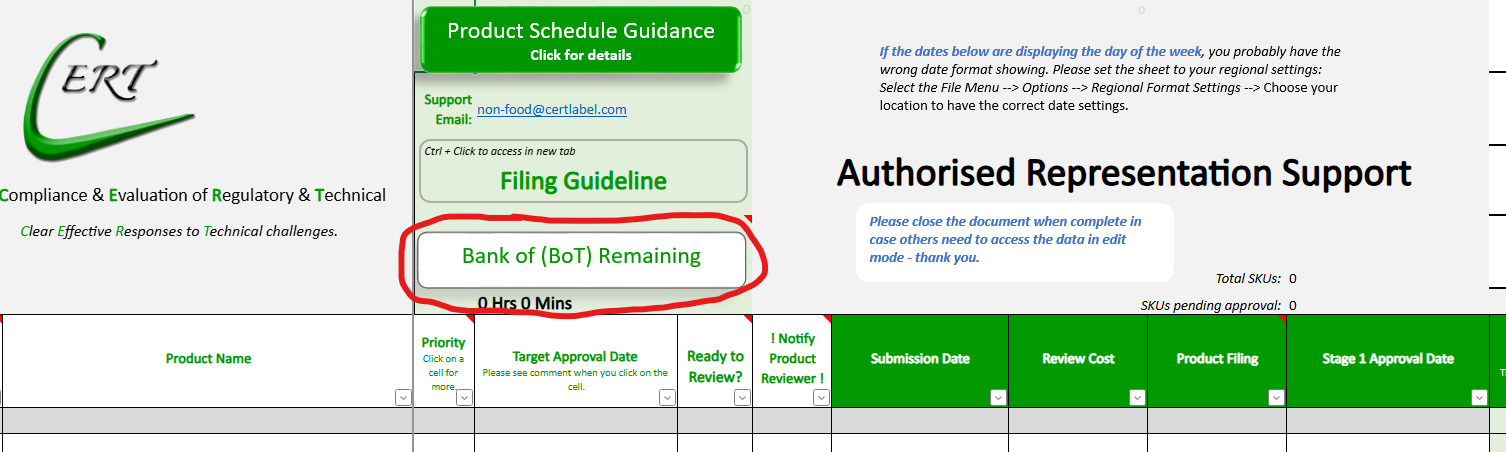 The Bank of Time can be quickly accessed by clicking on the Bank of Time (BoT)Remaining option on the Product Schedule on the main page. There is also a quick summary of the consultation time left underneath the button.