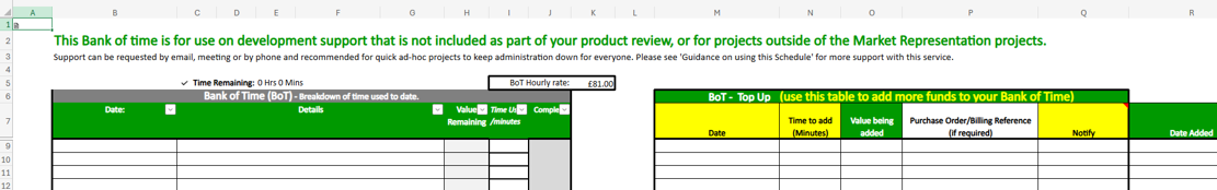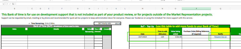When you have opened the Bank of Time, the table on the right hand-side is where you add more consultation time. Fill in the the yellow headed columns with the date and how much time (minutes) you would like to add.